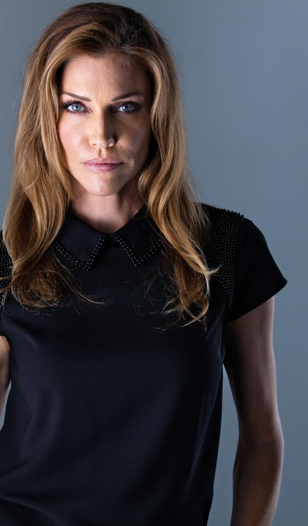 Wallpaper Canadian actress Tricia Helfer in a black dress on a gray background