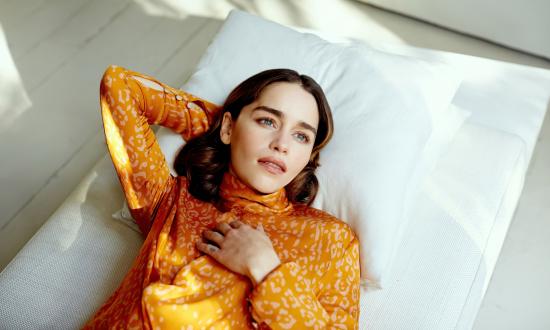 Wallpaper Actress Emilia Clarke lies on a white pillow