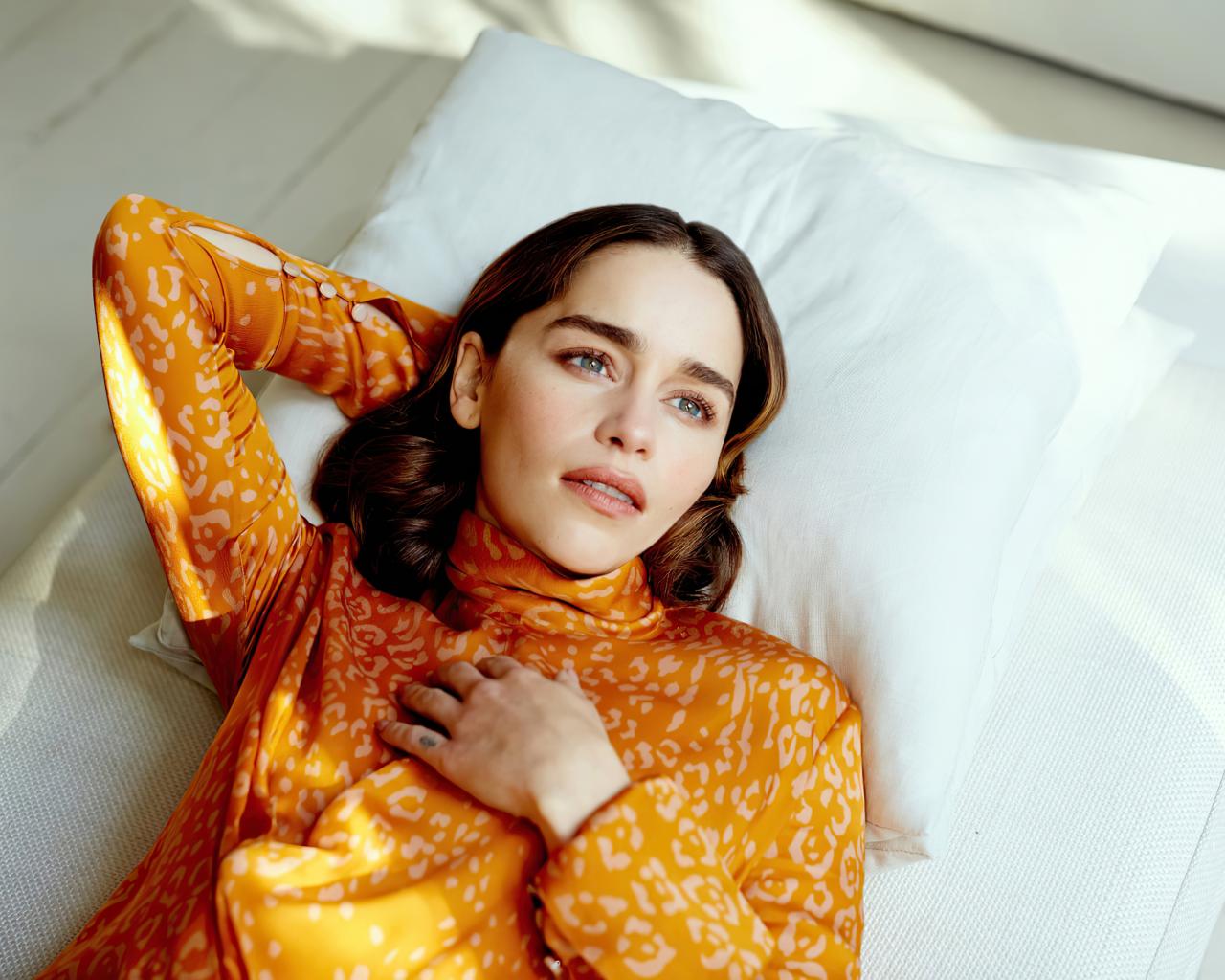Wallpaper Actress Emilia Clarke lies on a white pillow