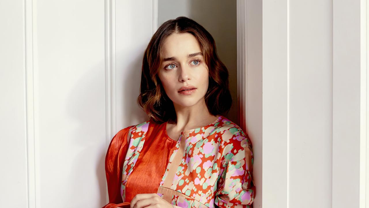 Wallpaper Actress Emilia Clark in a dress stands against the wall