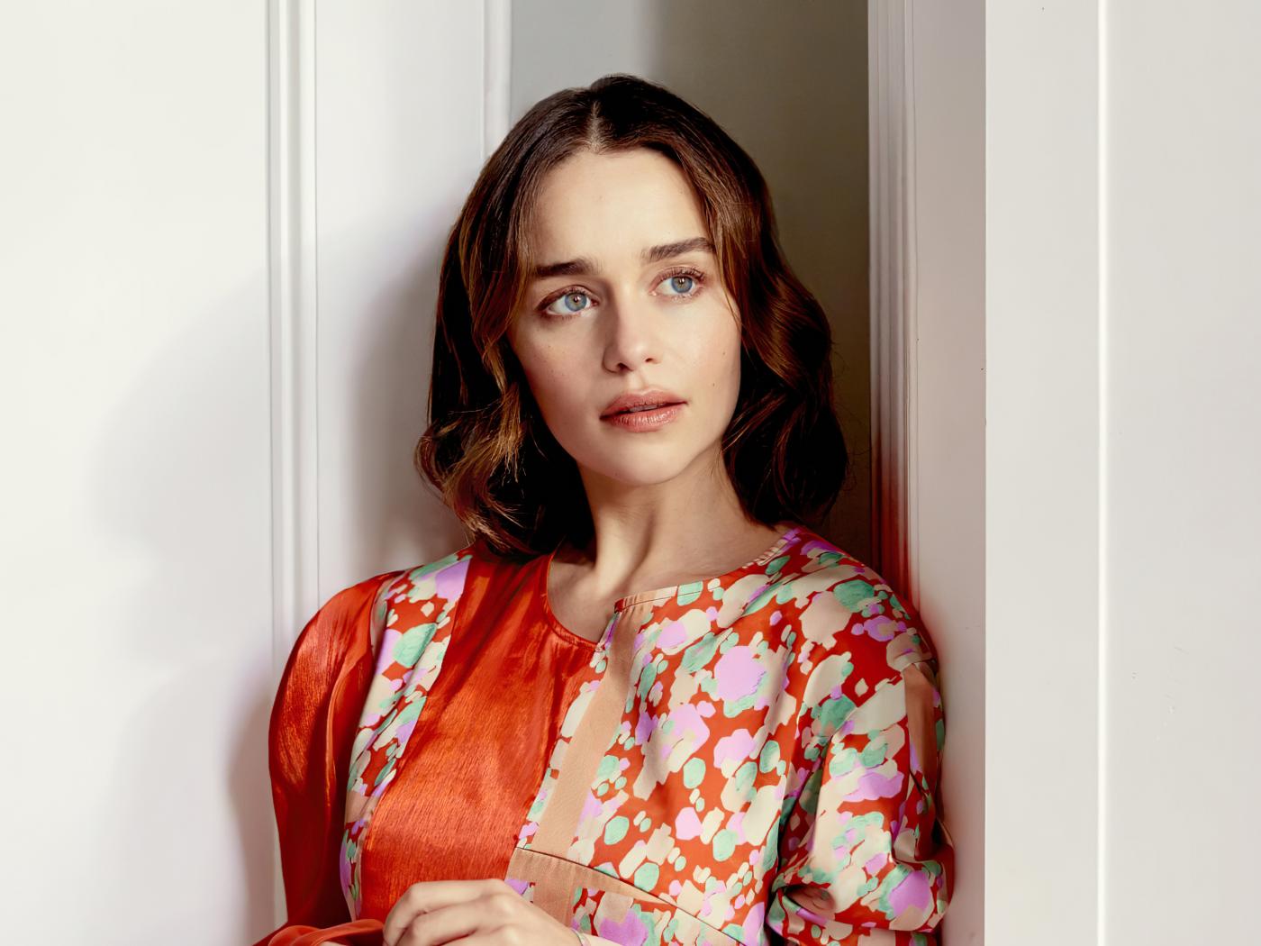 Wallpaper Actress Emilia Clark in a dress stands against the wall