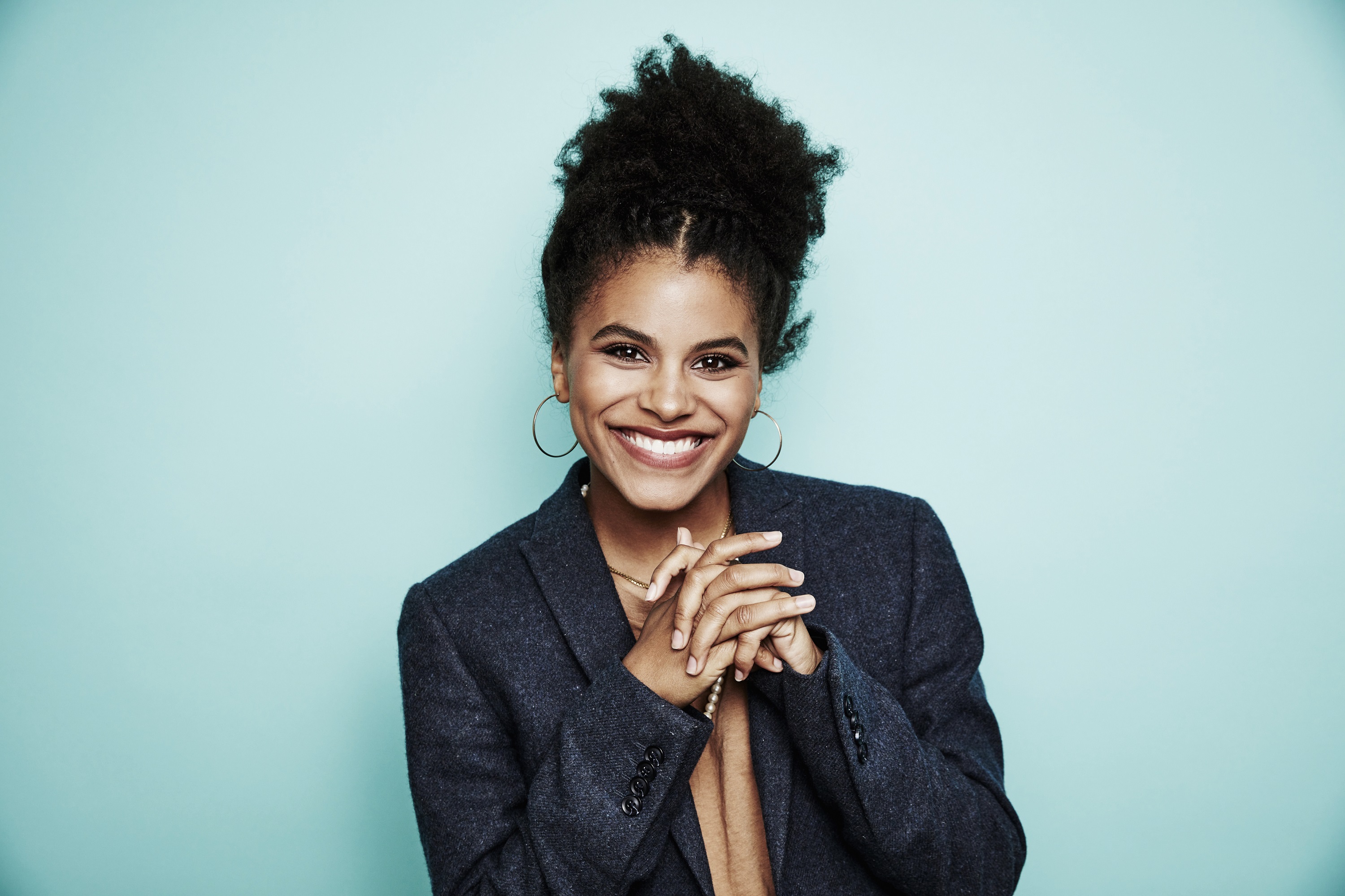 Wallpaper Smiling girl, actress Zazi Bitts in a gray jacket