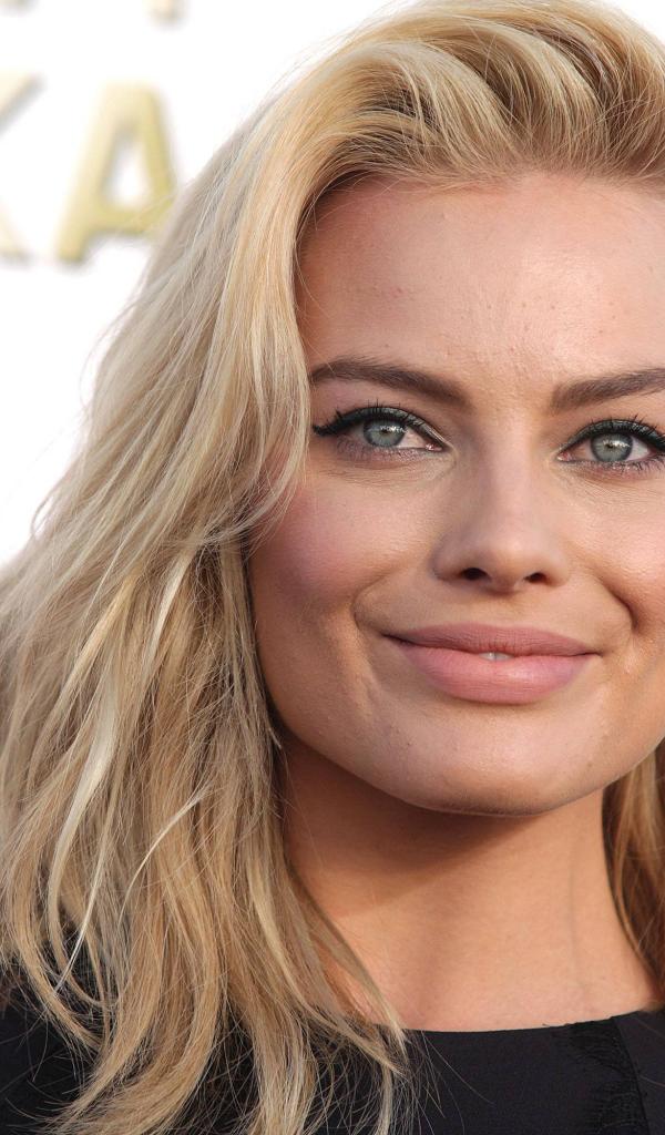 Wallpaper Smiling blonde actress Margot Robbie by the wall
