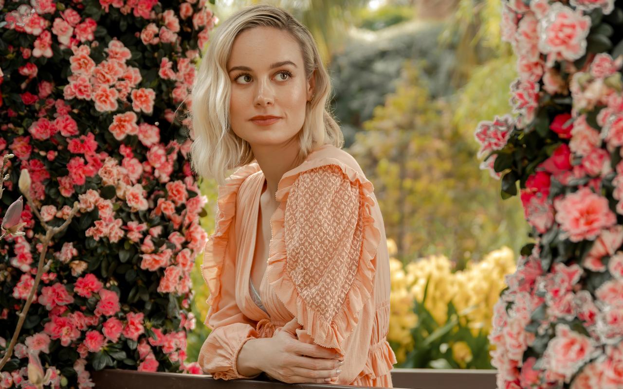 Wallpaper Actress Bree Larson sits near bushes with pink flowers