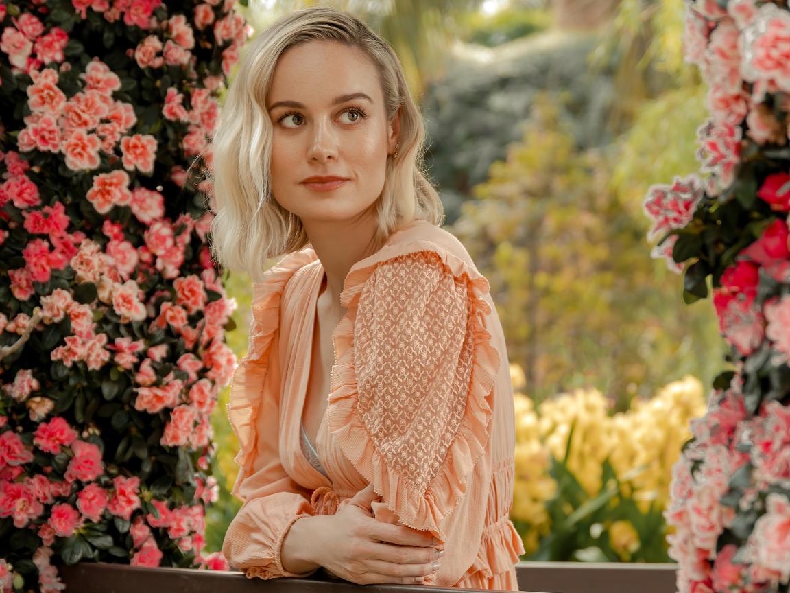 Wallpaper Actress Bree Larson sits near bushes with pink flowers