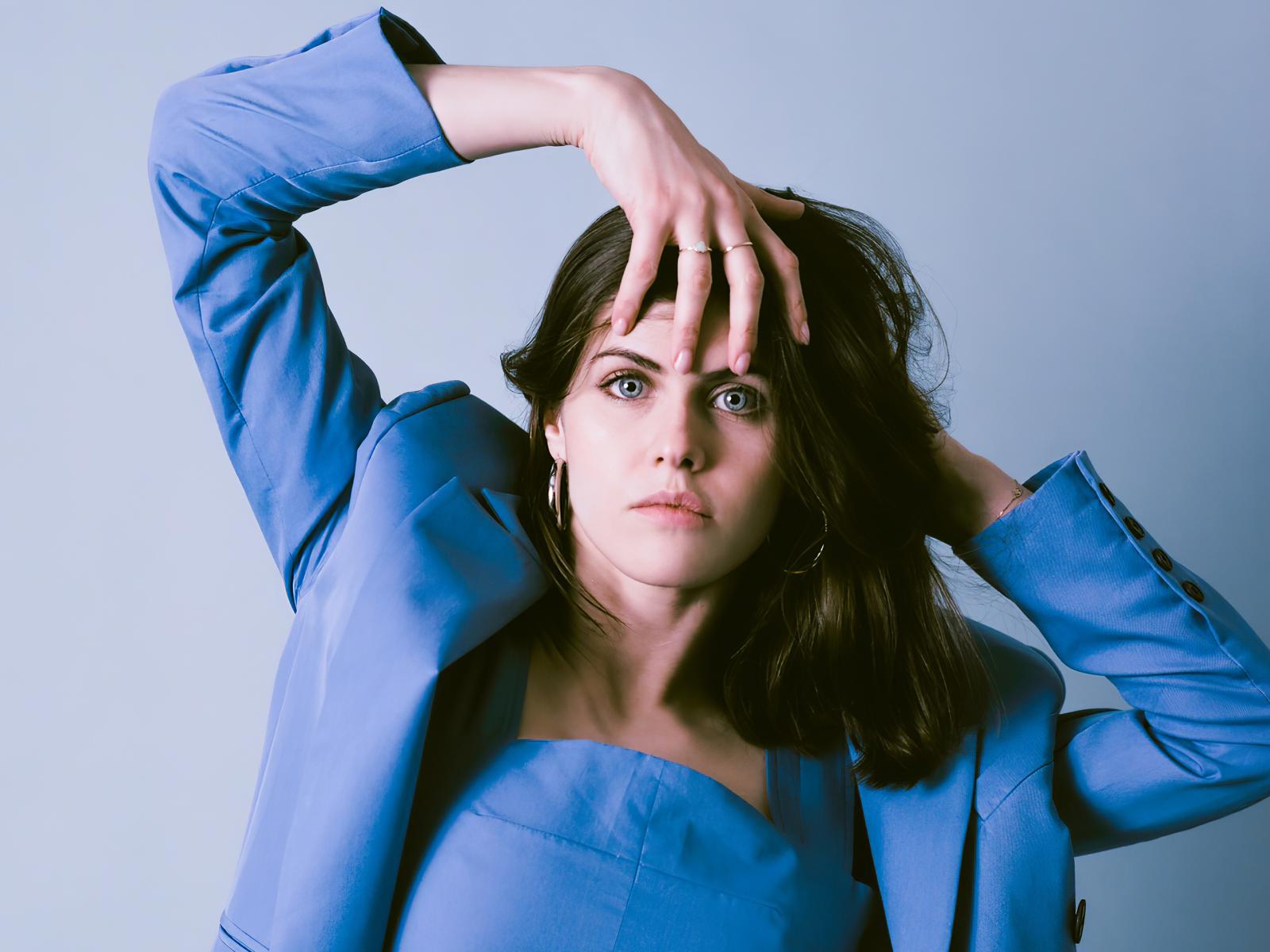 Wallpaper Actress Alexandra Daddario in a jacket on a gray background