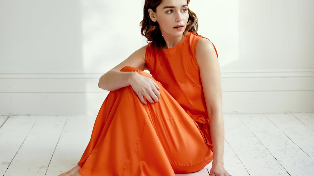 » Wallpaper Actress Emilia Clark in an orange dress sits on the floor