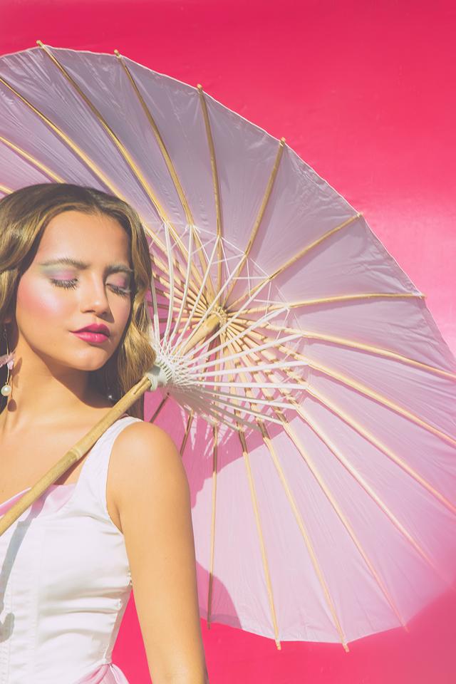 Wallpaper Actress Isabella Moner with a white umbrella on a pink background