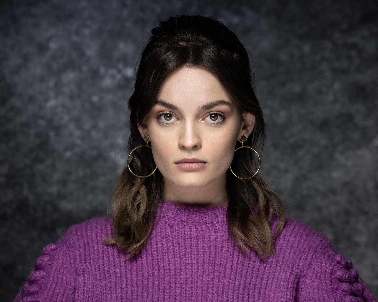 Wallpaper Actress Emma Mackay in a lilac sweater on a gray background