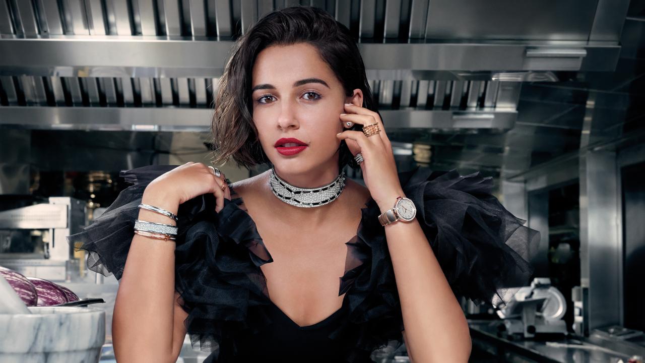 Wallpaper English actress Naomi Scott in a black dress in a cafe