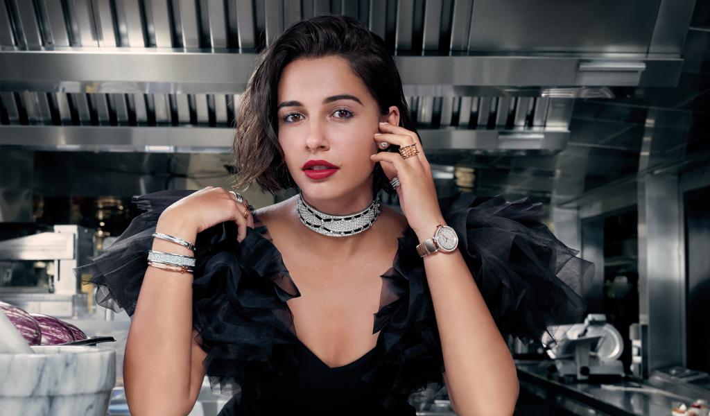 Wallpaper English actress Naomi Scott in a black dress in a cafe
