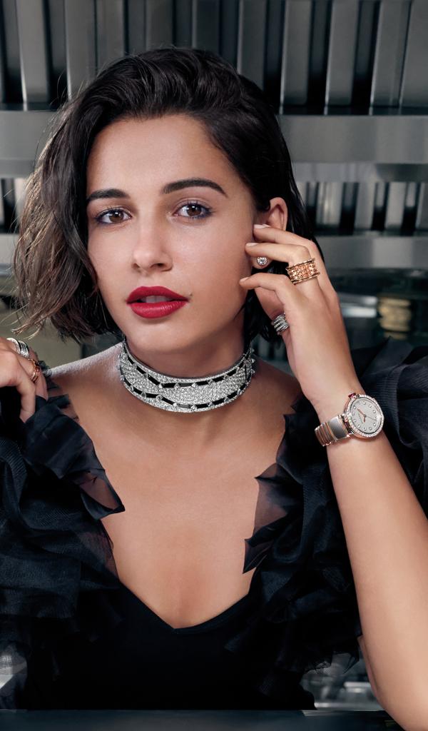 Wallpaper English actress Naomi Scott in a black dress in a cafe