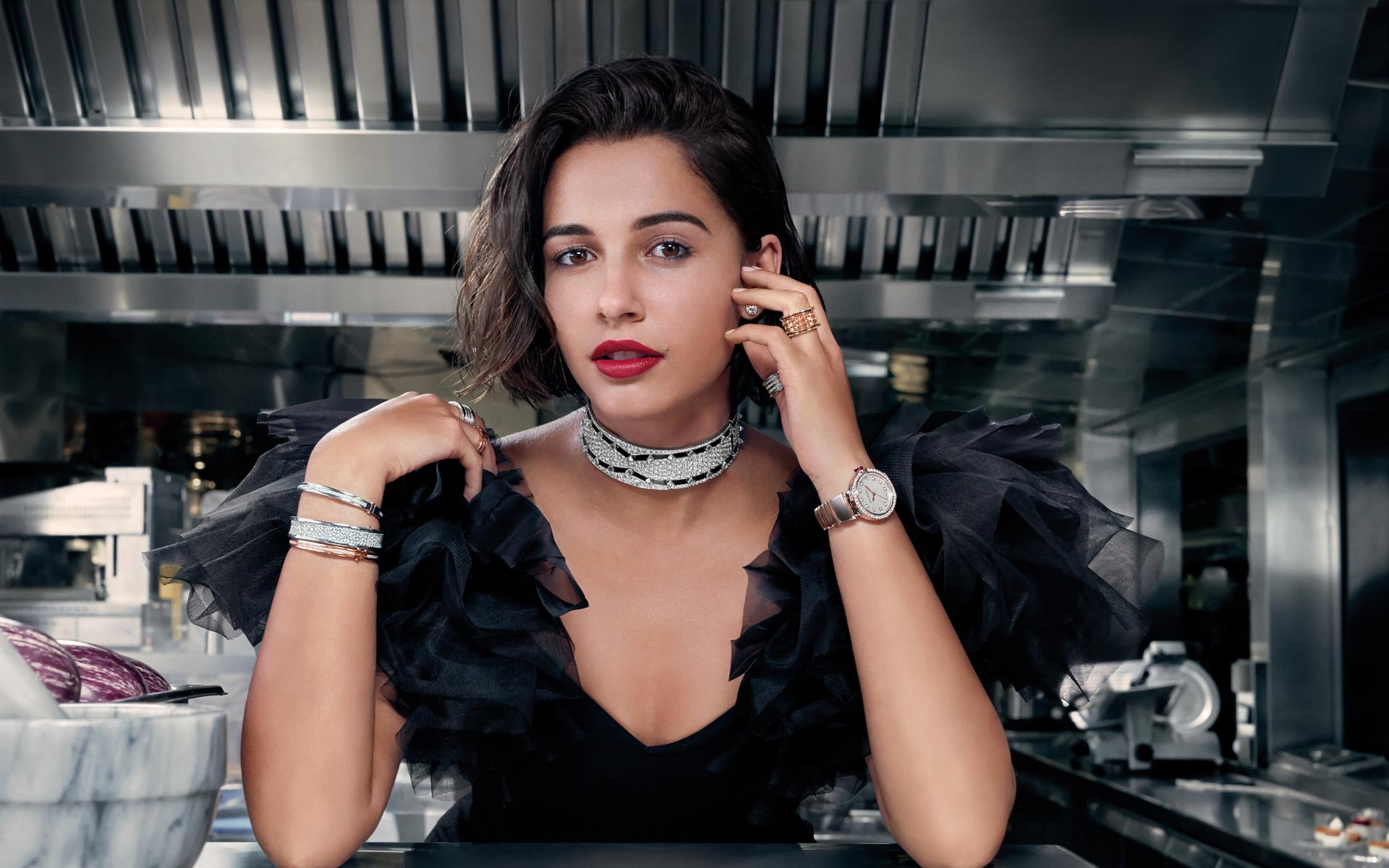 Wallpaper English actress Naomi Scott in a black dress in a cafe