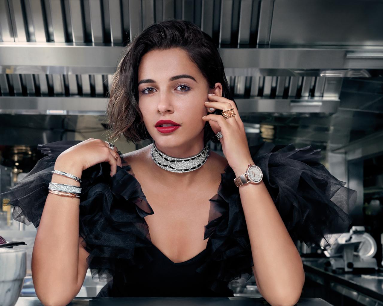Wallpaper English actress Naomi Scott in a black dress in a cafe