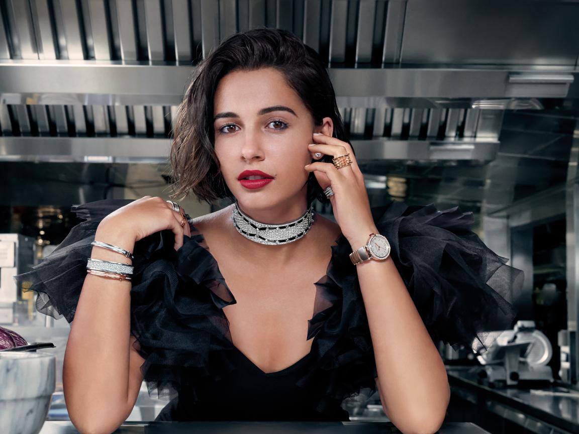 Wallpaper English actress Naomi Scott in a black dress in a cafe