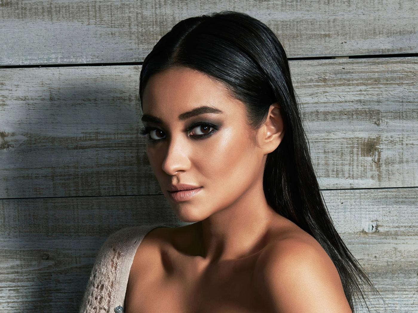 Wallpaper Canadian actress Shay Mitchell on a wooden background