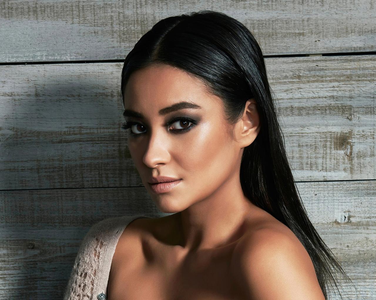 Wallpaper Canadian actress Shay Mitchell on a wooden background