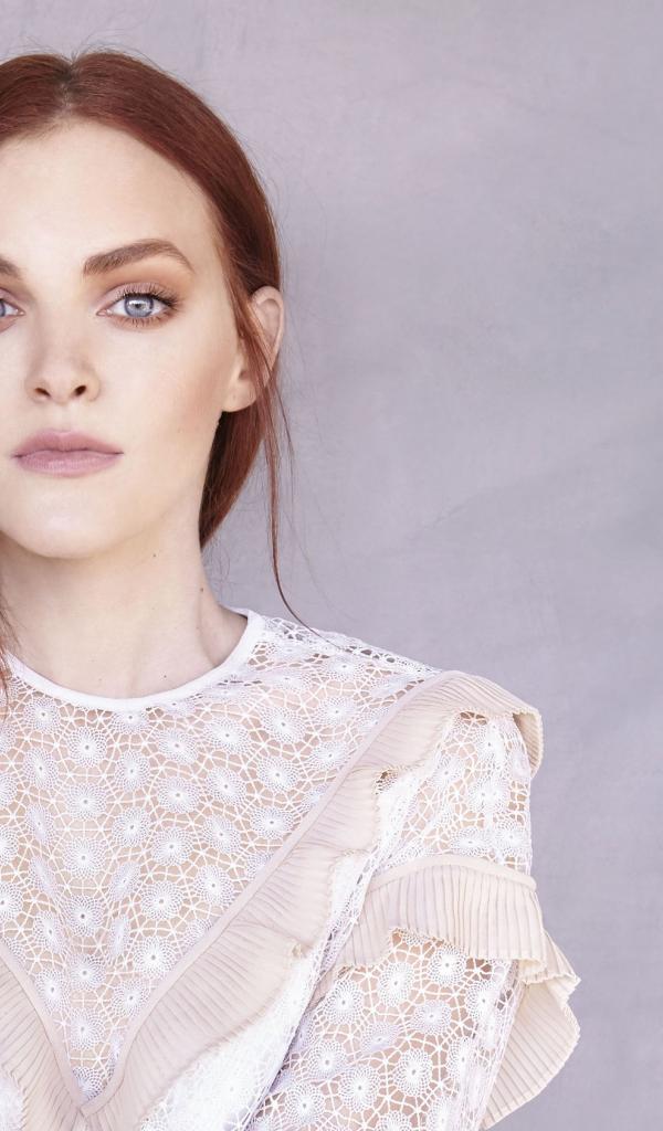 Wallpaper Actress Madeleine Brewer in a white dress on a wall background