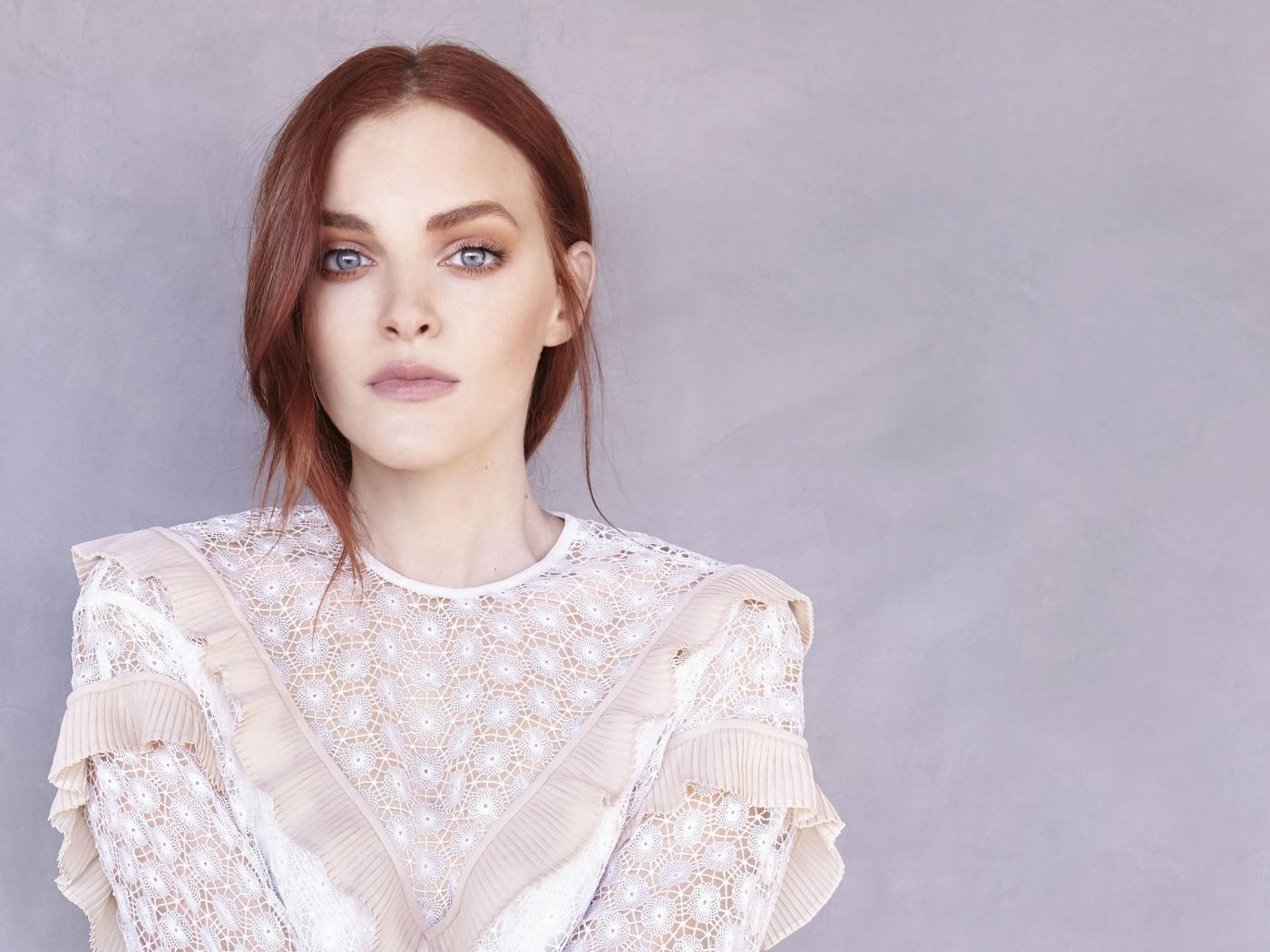 Wallpaper Actress Madeleine Brewer in a white dress on a wall background