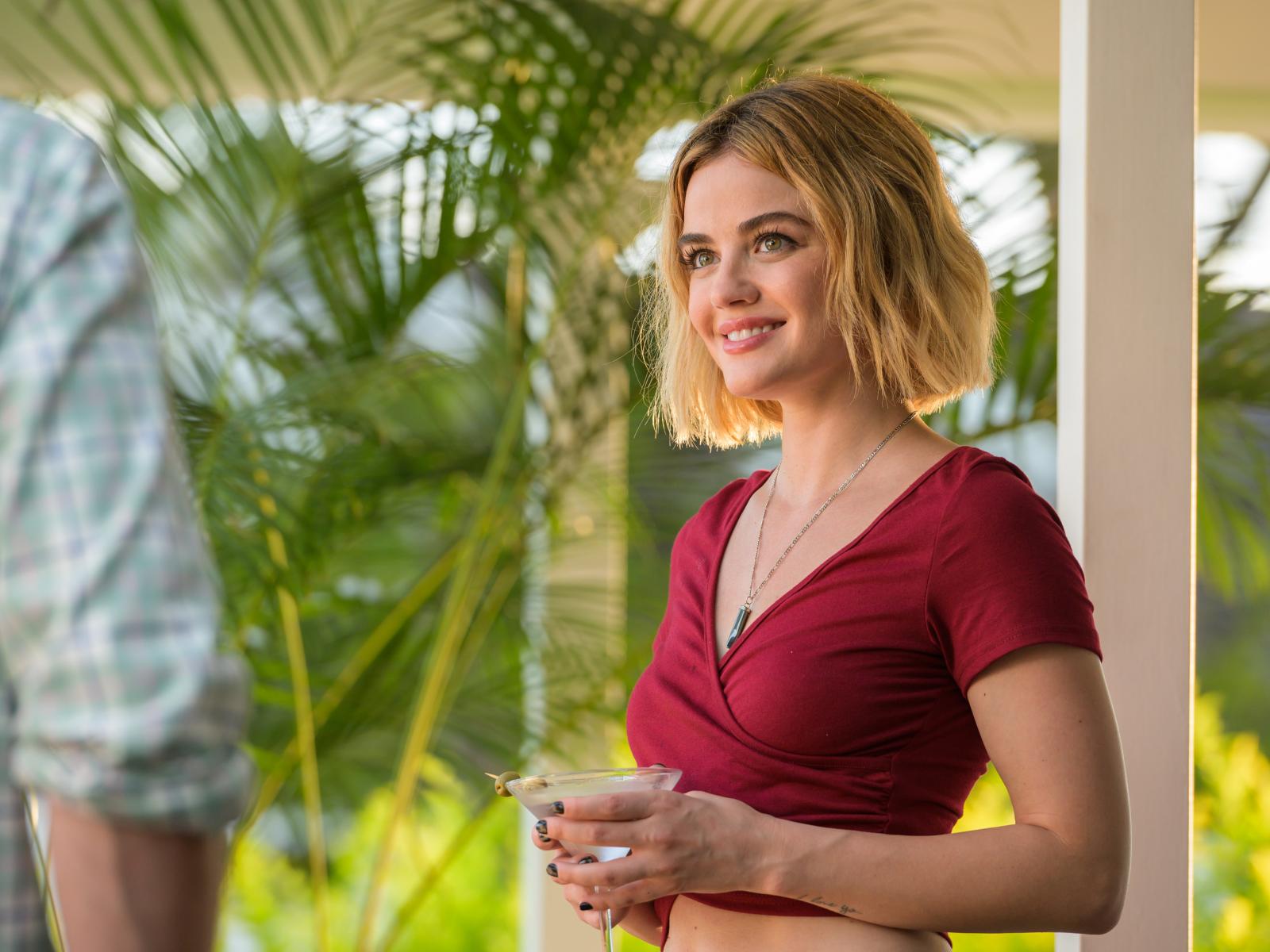 Wallpaper Smiling actress Lucy Hale with a cocktail in her hand