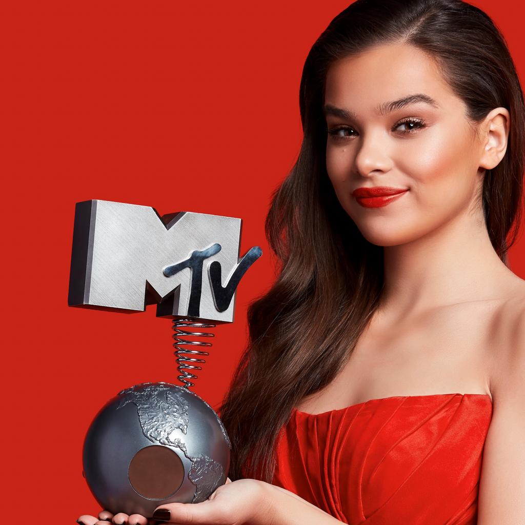 Wallpaper Actress Hayley Steinfield with MTV award on a red background