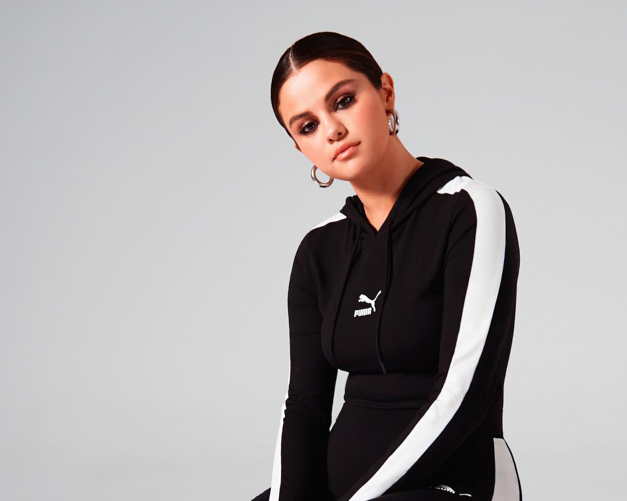 Wallpaper Actress, model Selena Gomez in a tracksuit on a gray background