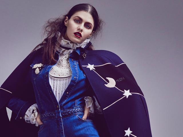 Wallpaper Actress Alexandra Daddario in a cape on a gray background