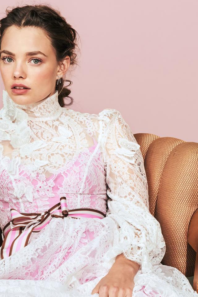 Wallpaper American actress Christine Froset in a pink dress in an armchair