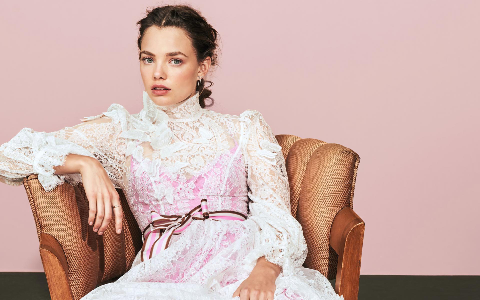 Wallpaper American actress Christine Froset in a pink dress in an armchair