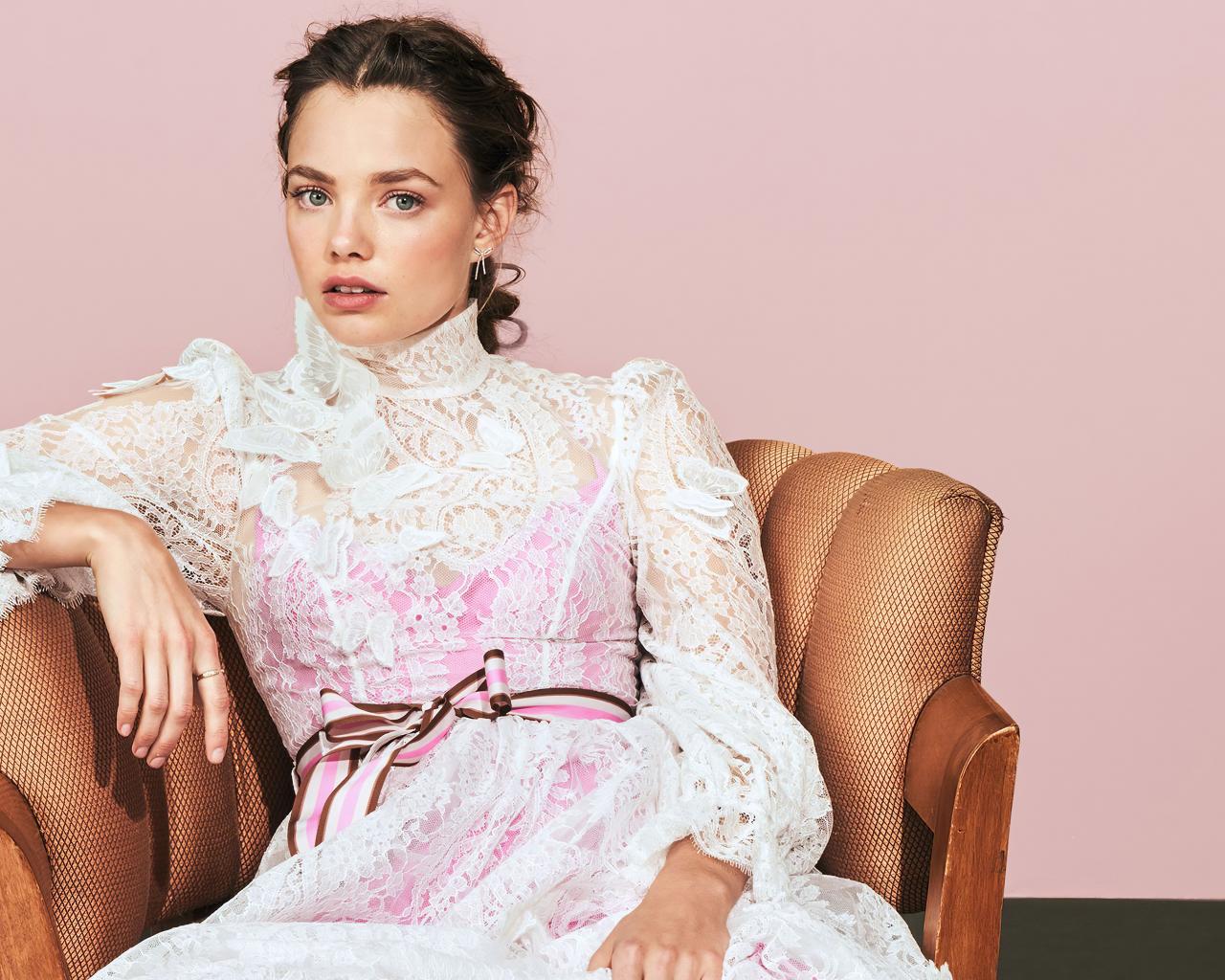 Wallpaper American actress Christine Froset in a pink dress in an armchair