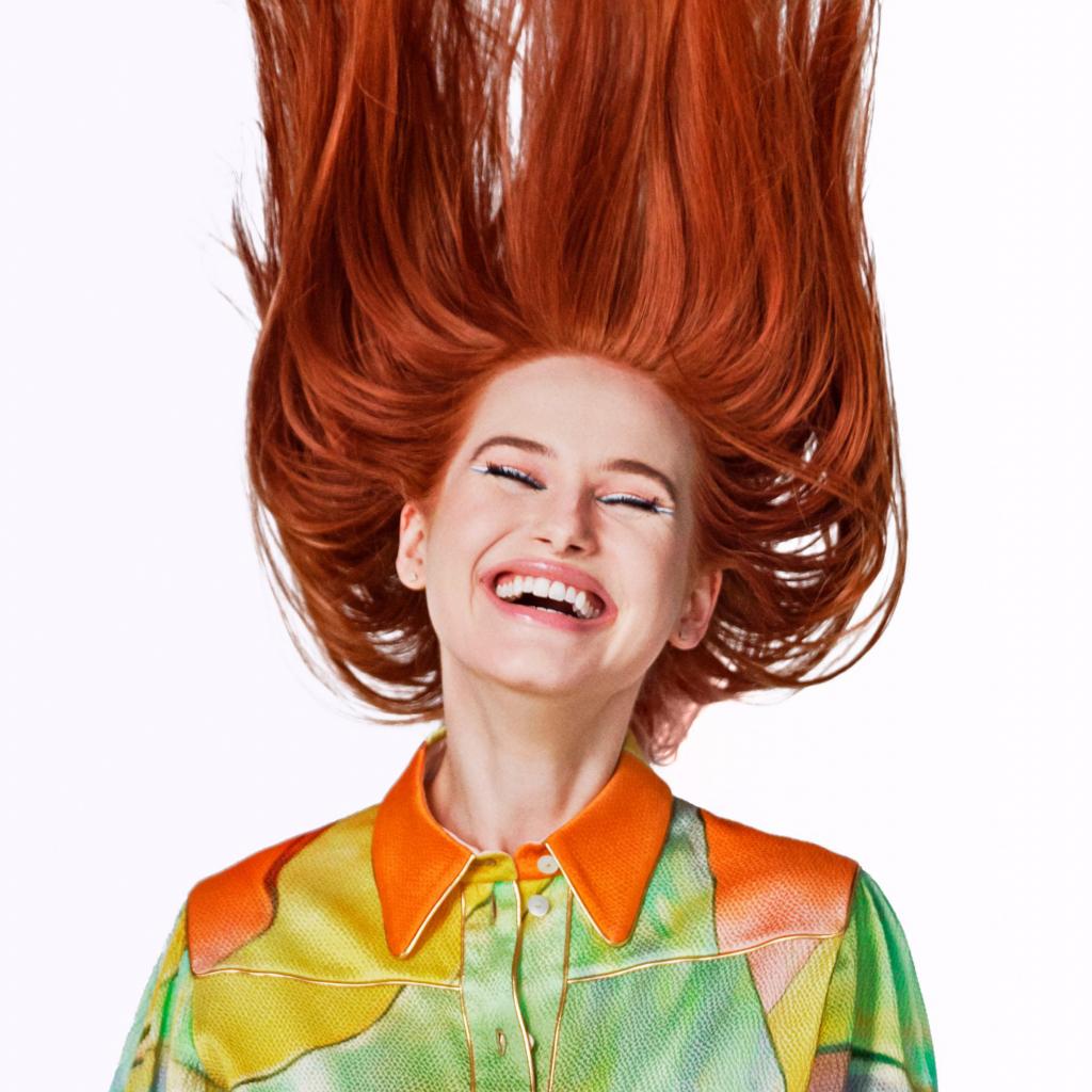 Wallpaper Smiling actress Madeline Petsh with red hair on a white background