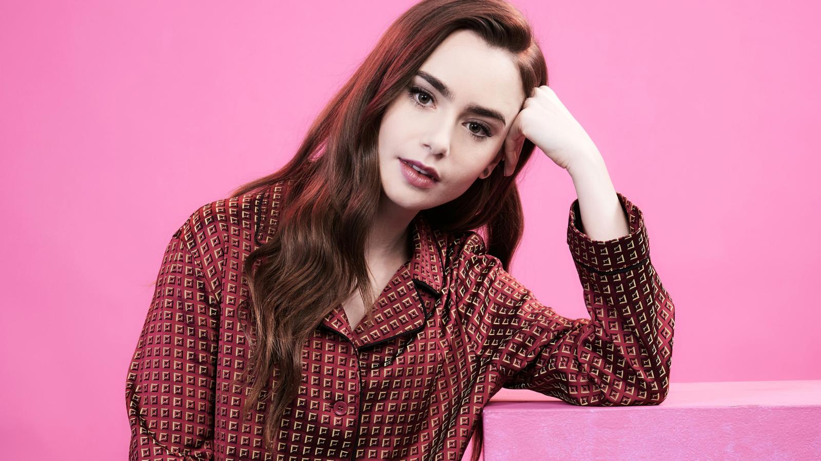Wallpaper Actress Lily Collins on a pink background