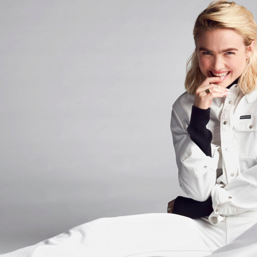 Wallpaper Young American actress Maddy Hasson in a white suit