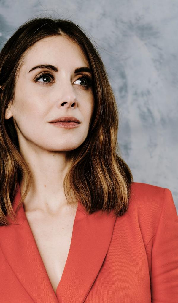 Wallpaper Actress Alison Brie in a red jacket on a gray background