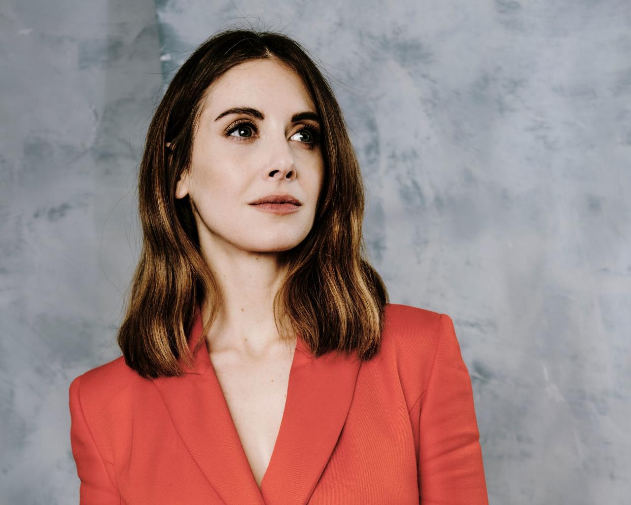 Wallpaper Actress Alison Brie in a red jacket on a gray background