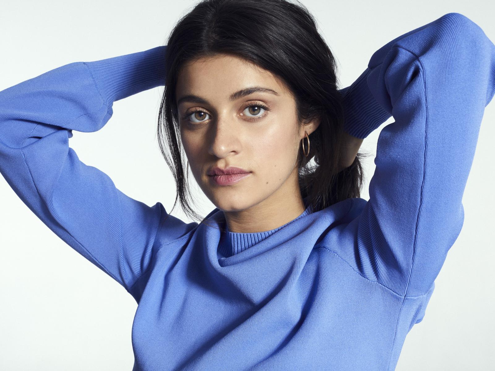 Wallpaper British actress Anya Chalotra in a blue sweater
