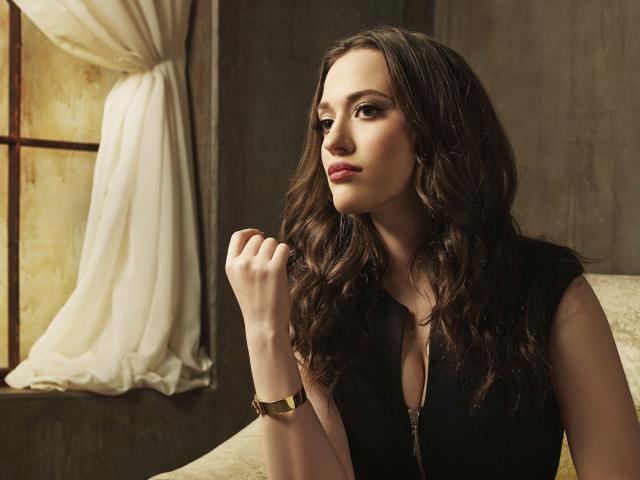 Wallpaper Actress Kat Dennings in a black outfit in an armchair