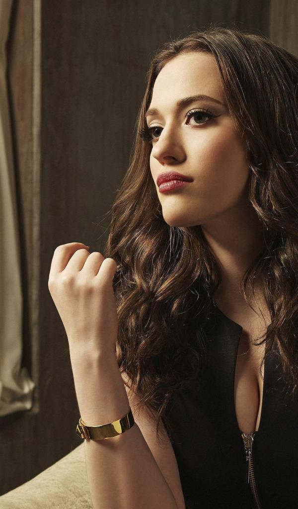Wallpaper Actress Kat Dennings in a black outfit in an armchair