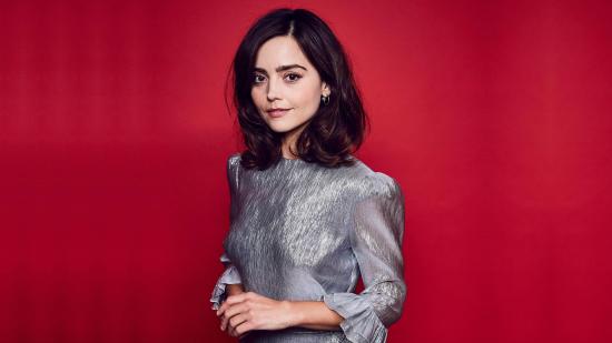 Wallpaper American actress Jenna Coleman in a gray dress on a red background