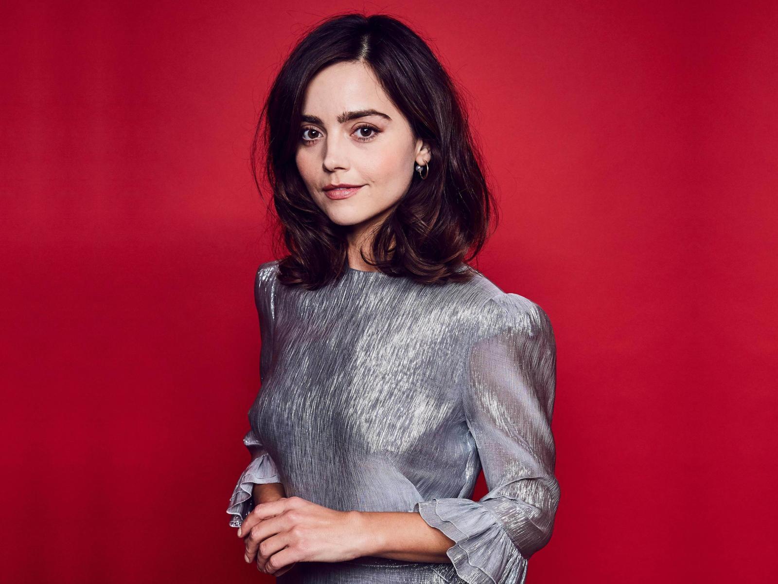Wallpaper American actress Jenna Coleman in a gray dress on a red background