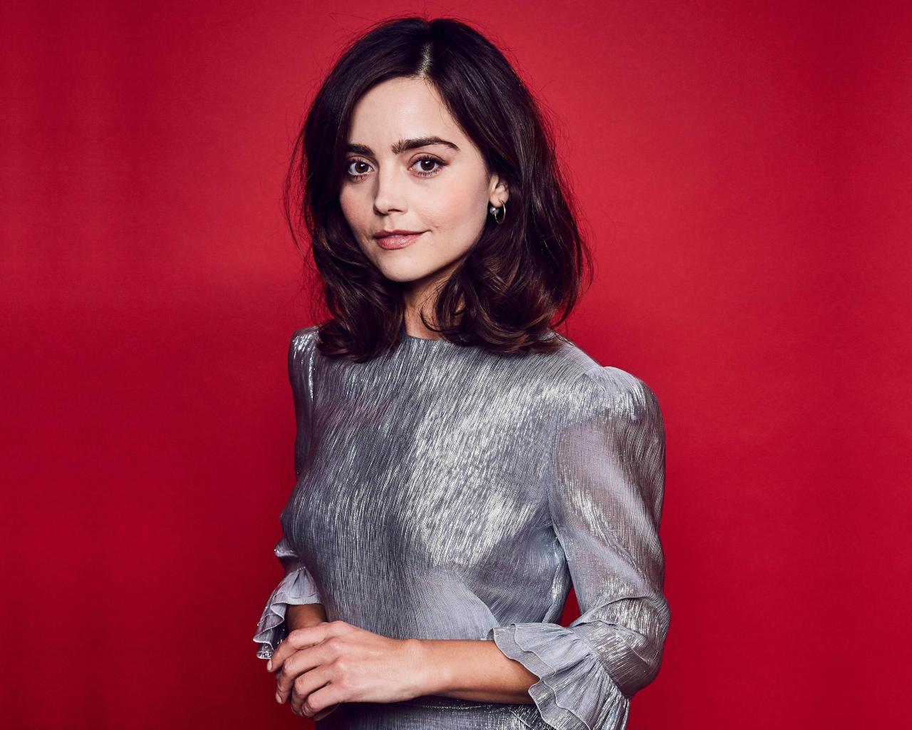 Wallpaper American actress Jenna Coleman in a gray dress on a red background