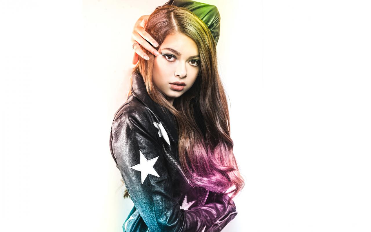 Wallpaper Actress Nikki Khan in a black jacket on a white background