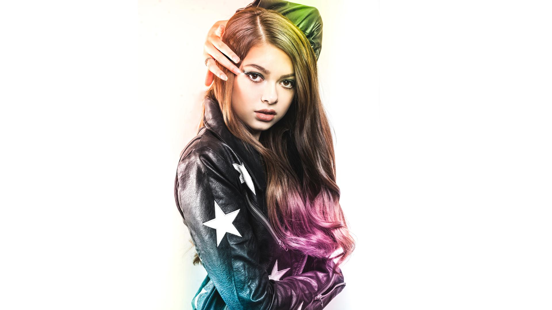 Wallpaper Actress Nikki Khan in a black jacket on a white background
