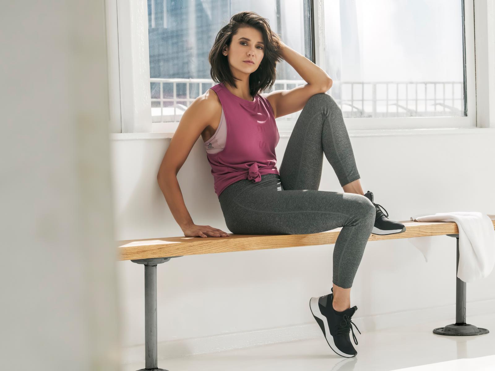 Wallpaper Actress Nina Dobrev sits on a bench in a tracksuit