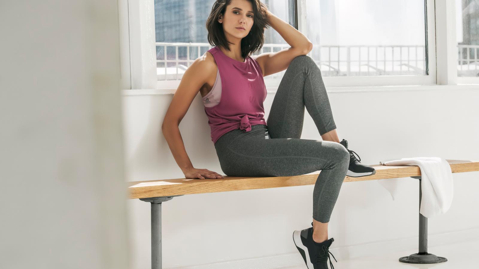 Wallpaper Actress Nina Dobrev sits on a bench in a tracksuit