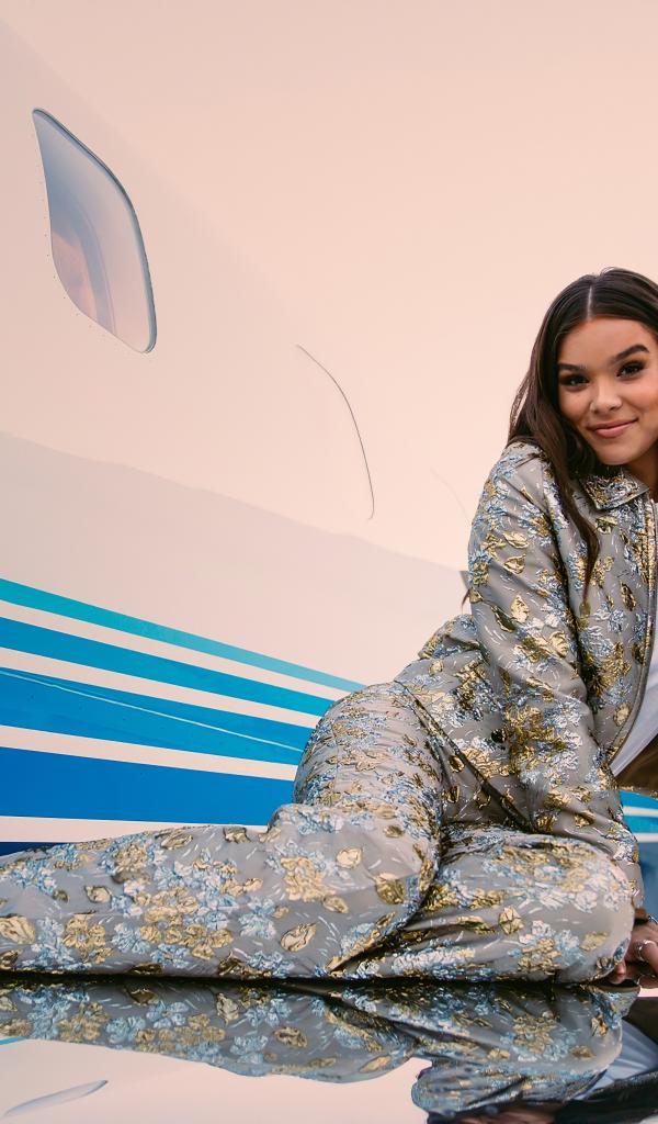 Wallpaper Actress Hayley Steinfield in a suit lies on the wing of an airplane