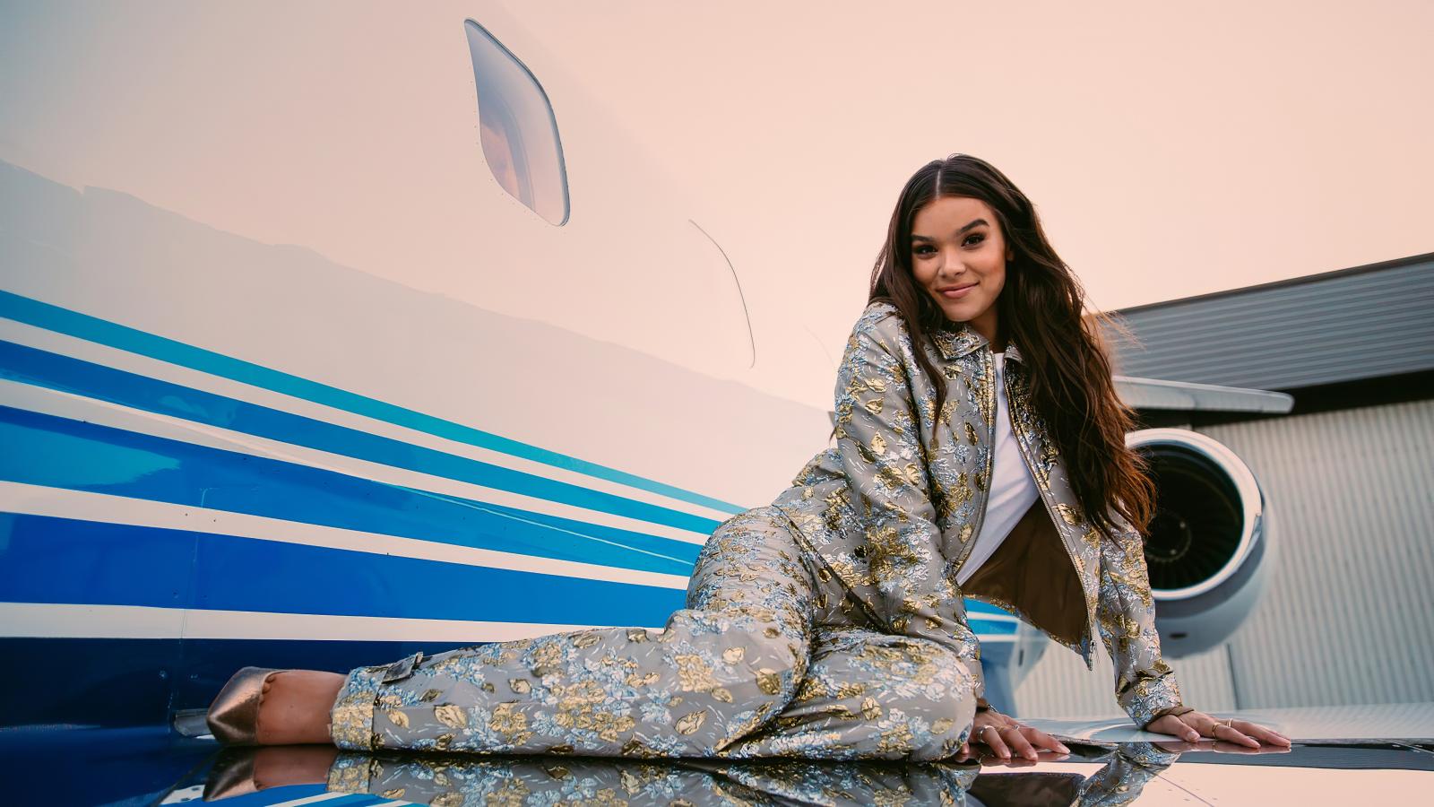 Wallpaper Actress Hayley Steinfield in a suit lies on the wing of an airplane