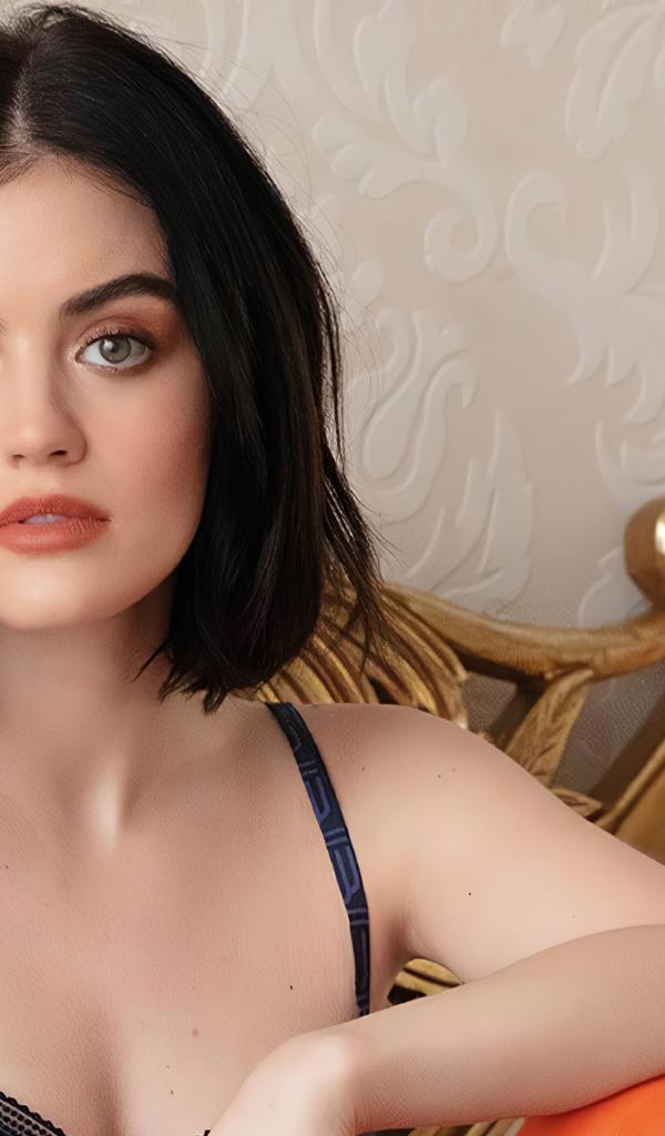 Wallpaper Beautiful girl, actress Lucy Hale sits on a sofa