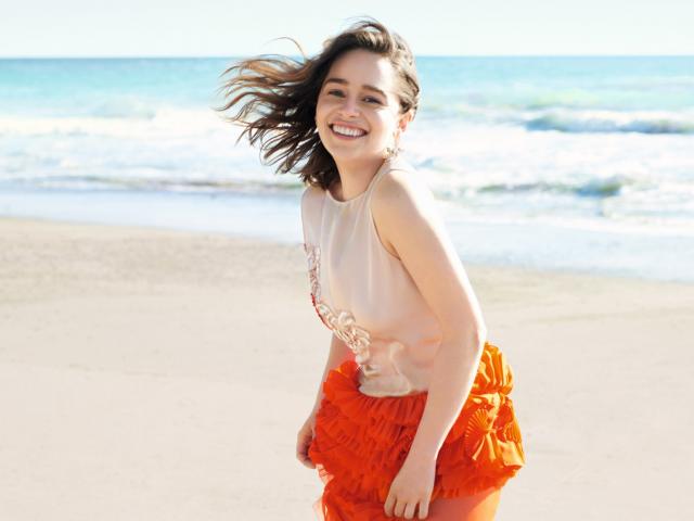 Wallpaper Smiling girl, actress Emilia Clarke on the background of the sea