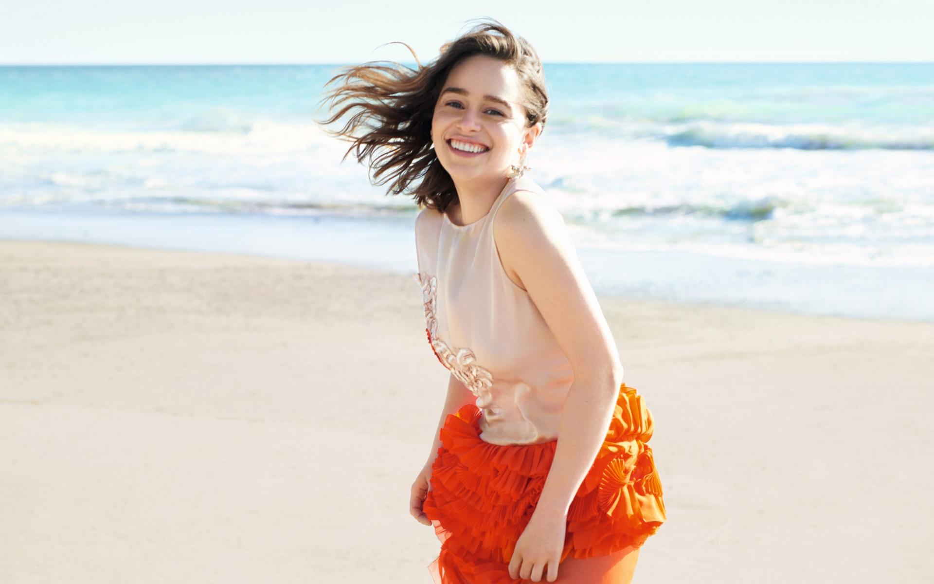 Wallpaper Smiling girl, actress Emilia Clarke on the background of the sea